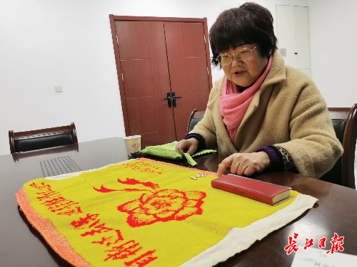 “憶崢嶸歲月”活動上,劉慧曾帶著她參軍時獲得的紀念品枕巾和紀念章與大家一起分享故事。 長江日報見習記者秦璟 攝