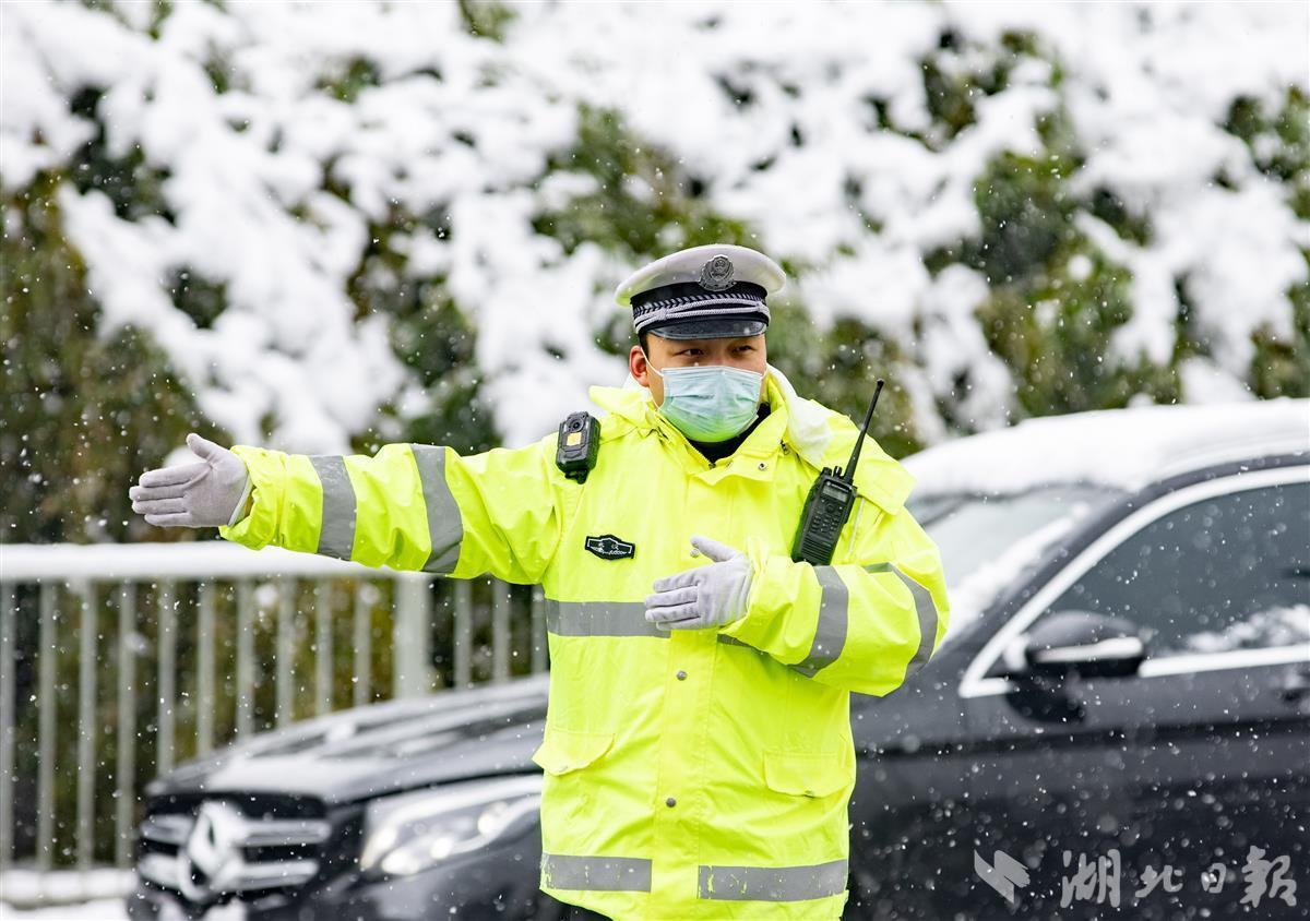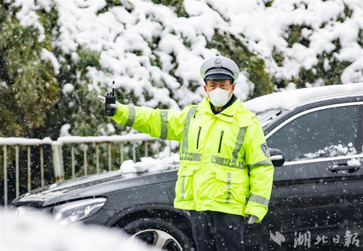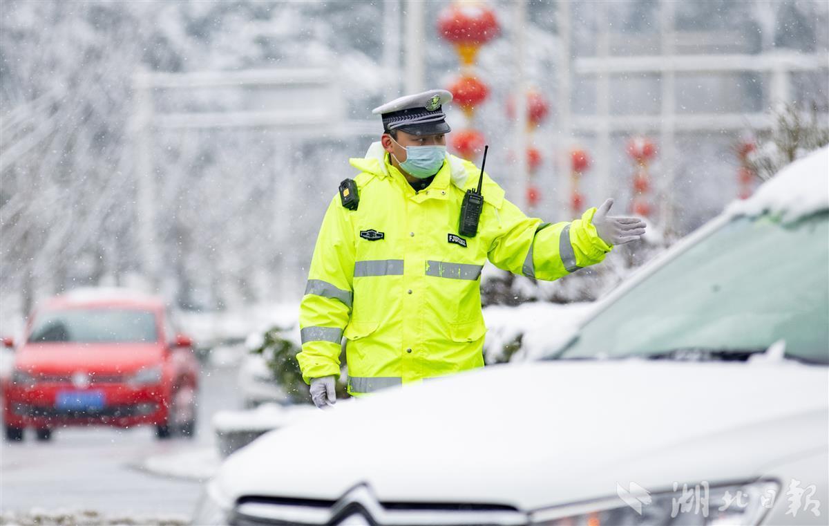 2月7日,武漢梨園廣場附近,交警在雪中指揮交通。(湖北日報(bào)全媒記者 柯皓 攝)