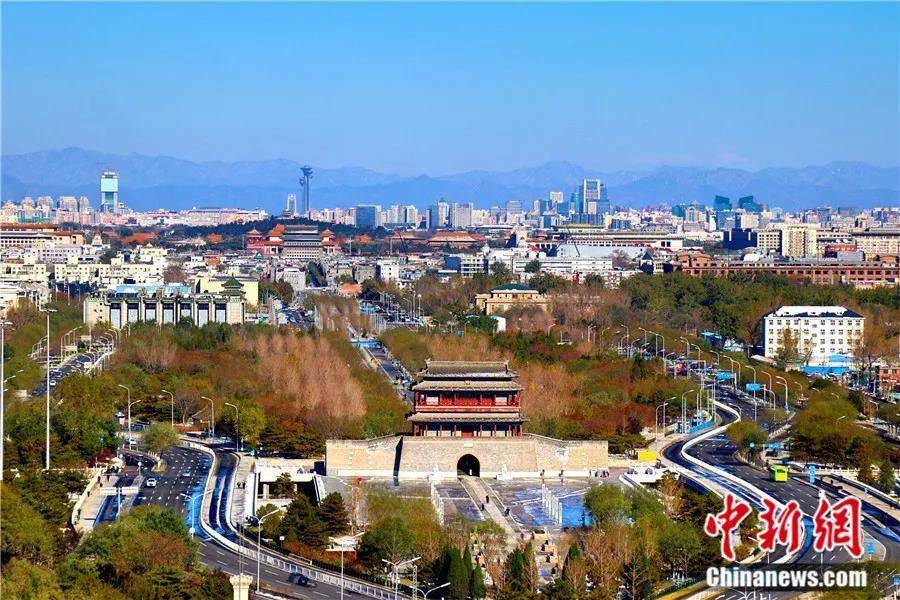 2021年11月,北京陽光明媚,中軸線一帶秋色迷人。北京中軸線北起鐘鼓樓,向南經過萬寧橋、景山、故宮、天安門廣場、正陽門,至永定門,貫穿北京老城南北,全長約7.8公里。中新社發 牛云崗 攝