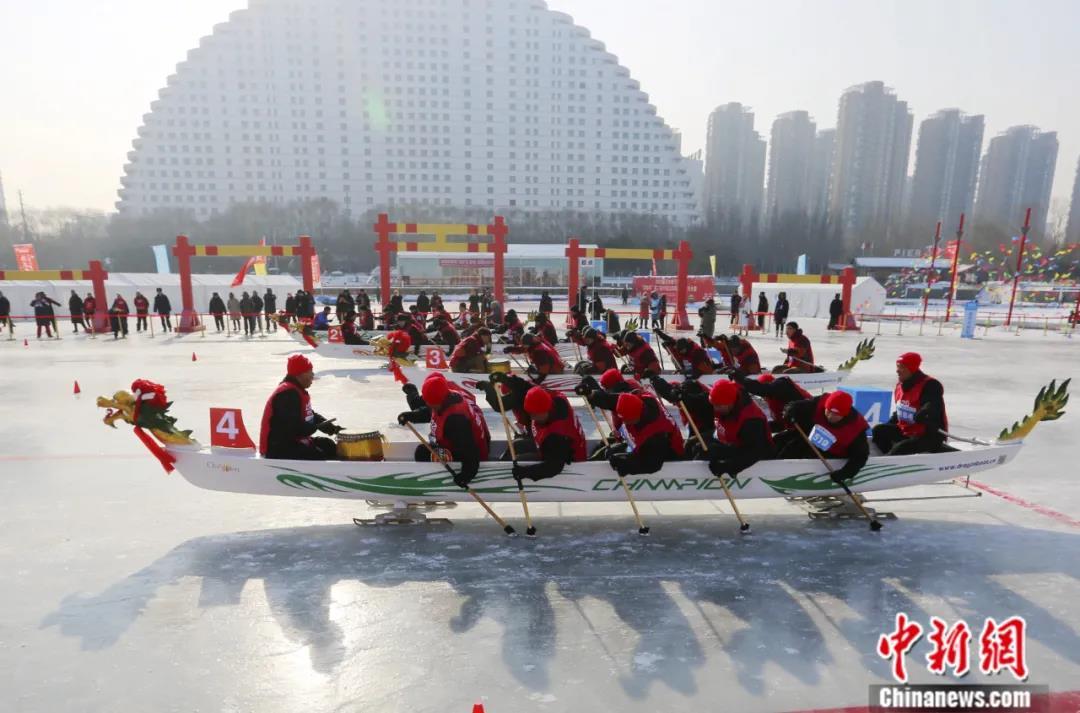 2020年1月12日,遼寧省沈陽(yáng)市渾河奧林匹克公園3號(hào)碼頭,盛京冰嬉節(jié)·沈陽(yáng)國(guó)際冰龍舟總決賽舉行。中新社發(fā) 劉寶成 攝