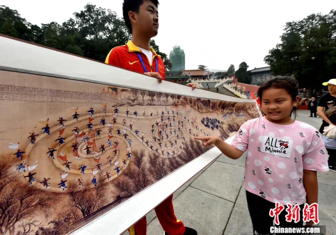 2021年10月3日,在北京八大處國(guó)慶游園會(huì)上,《冰嬉圖》復(fù)制展品吸引游人的目光。中新社發(fā) 李文明 攝