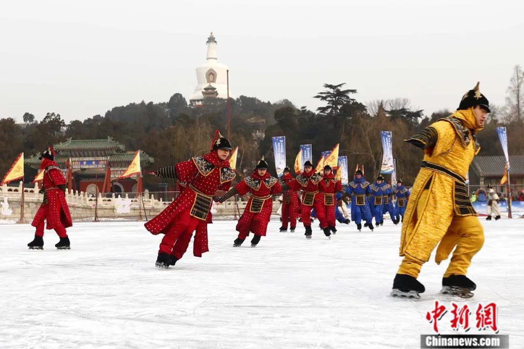 2016年1月20日,大寒節(jié)氣,表演者穿著清朝八旗服飾在北京北海公園上演皇家“冰嬉”。中新社記者 富田 攝