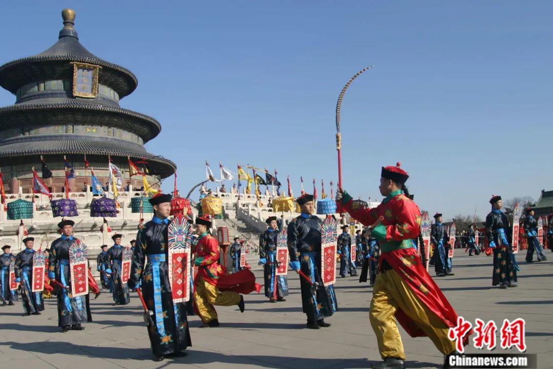 2004年1月,祭天樂舞表演在北京天壇祈年殿前進(jìn)行著裝彩排。中新社記者 盛佳鵬 攝