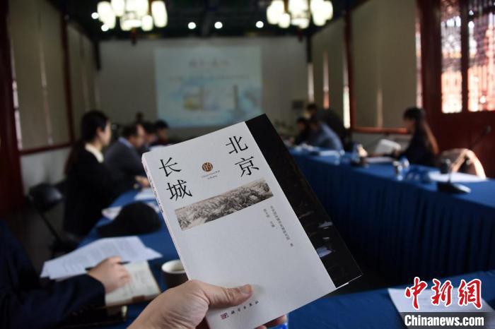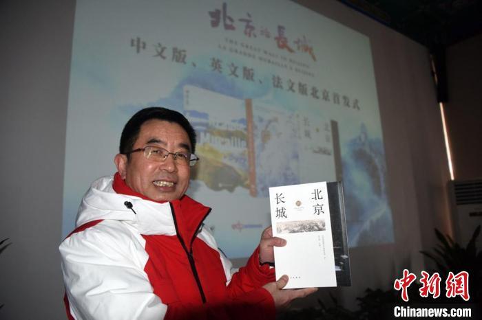 《北京的長城》主編、北京國際城市發展研究院院長連玉明在首發式上展示新書?!≈行律缬浾? 孫自法 攝