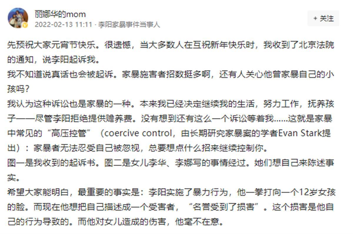 Kim稱,這種訴訟也是屬于家暴的一種。其在文中寫到:李陽實施了暴力行為,他一拳打向一個12歲女孩的臉。而現在他想把自己描述成一個受害者,“名譽受到了損害”。這個損害是他自己的行為導致的。而他對女兒造成的傷害,他毫不在意。
