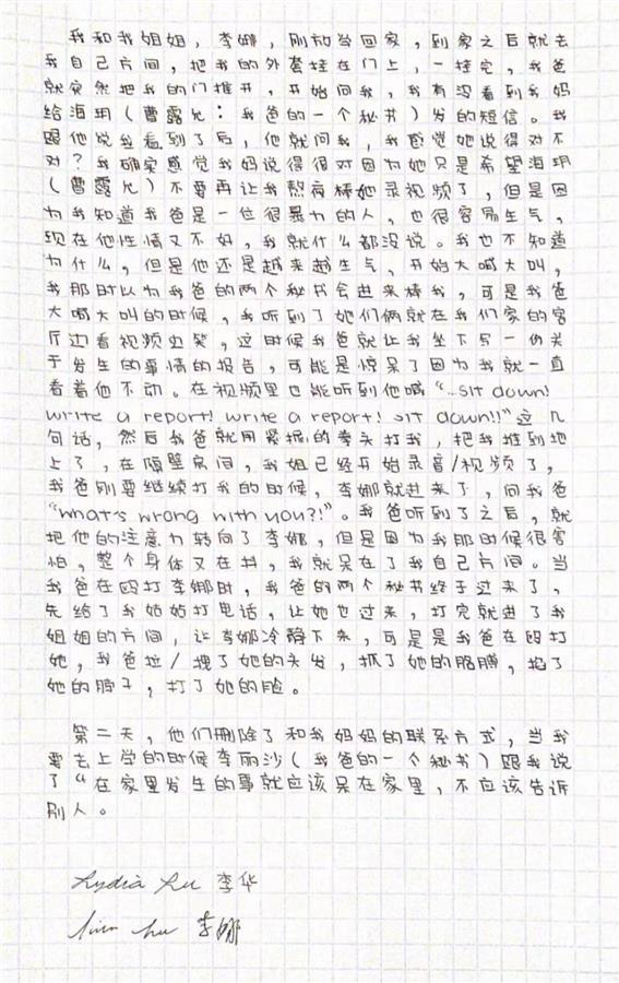 此前,2021年8月29日,Kim在微博發布視頻,控訴李陽家暴其女兒。視頻中沒有畫面,但傳出女孩哭聲,一男子正在大吼,命令他人站到墻角。另還有第二個女孩與男子爭吵。8月31日,Kim通過微博繼續放出自己和女兒李娜、李華的聊天記錄。李娜稱,他聽到父親打妹妹李華和李華的哭聲。當自己發聲反抗李陽時,李陽便開始打自己。期間,李陽還試圖拽住她的頭發將她推倒在地。小女兒李華發送給Kim的照片顯示,自己的唇部上方有傷痕。