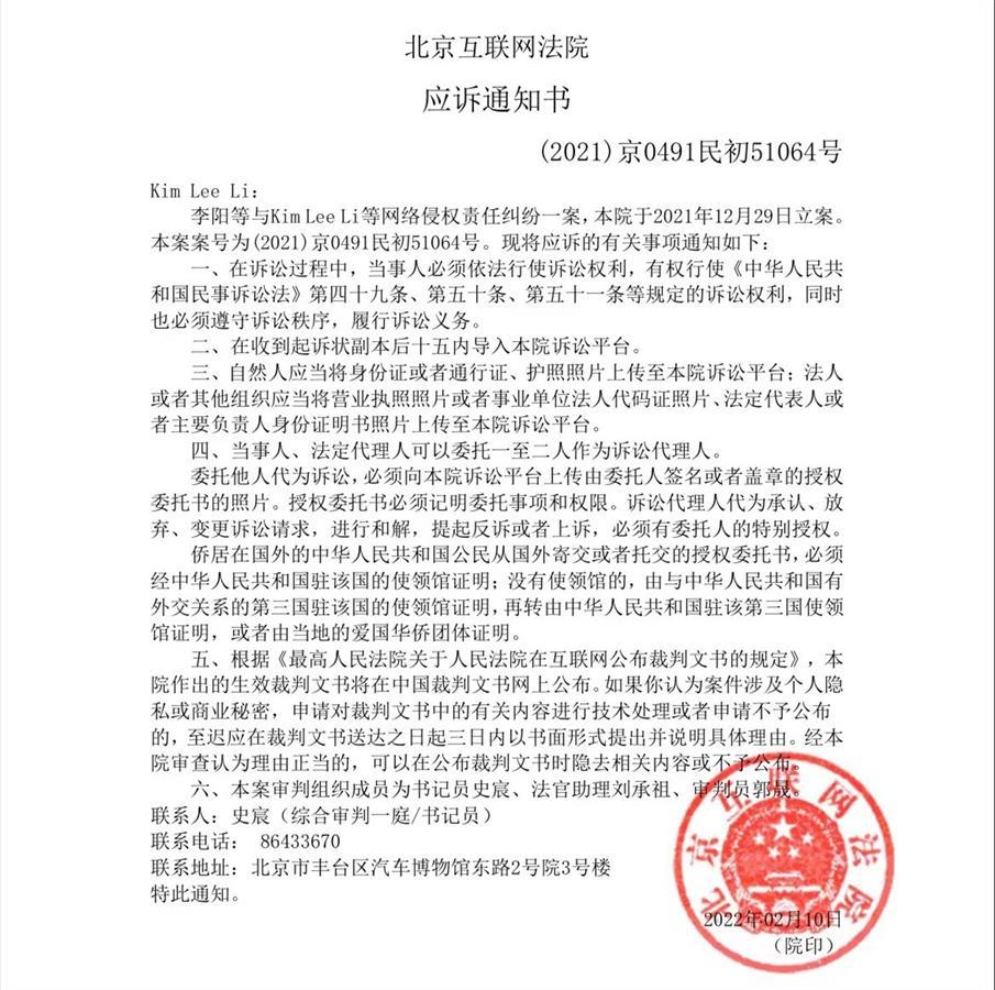 13日中午11時許,李陽前妻Kim在社交平臺發布文章稱,自己于日前收到了北京互聯網法院的通知,李陽向法院起訴了自己。