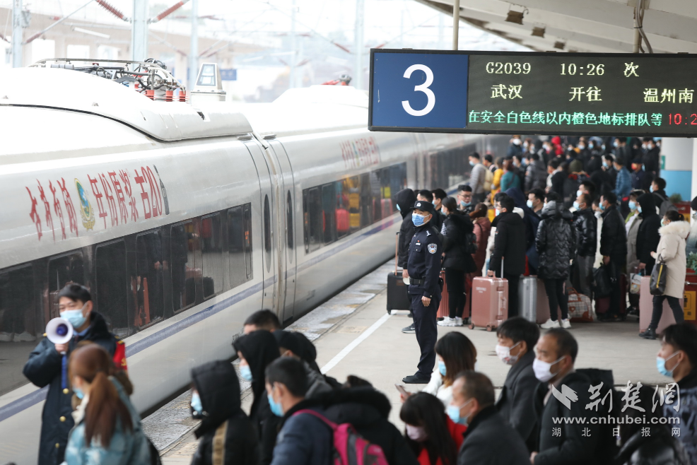 10時26分,G2039次列車伴隨站臺的打鈴聲,滿載400余名陽新旅客開向浙江溫州,站在車廂內(nèi)的田女士透過車窗,向站臺上幫助他的民警不斷揮手致謝。