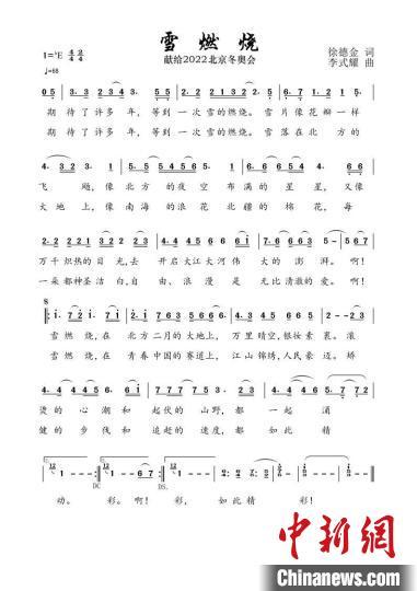 中新社正式發布公益歌曲《雪燃燒》。圖為曲譜。 詞曲作者提供">
