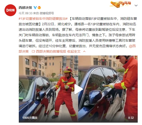 2月22日,湖北咸寧。通城縣一名1歲幼童被鎖在車內,消防站迅速出動消防救援人員到現場。據了解,母親將幼童放到副駕駛位后沒注意,下車關門時車輛自動落鎖,車鑰匙放在車內無法開門,情急之下。孩子母親嘗試用磚頭砸車窗,但沒有砸開,經車主同意后,消防救援人員使用鐵錘等工具對車窗玻璃進行破拆。經過近10分鐘處置,幼童被救出,并無受傷且情緒狀態良好。