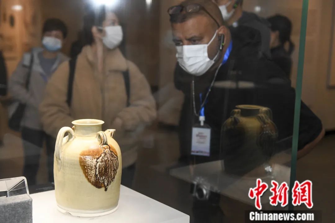 外國人在長沙銅官窯博物館參觀出土文物青釉褐斑貼椰棗紋瓷壺。椰棗紋具有顯見的西亞風格。中新社記者 楊華峰 攝