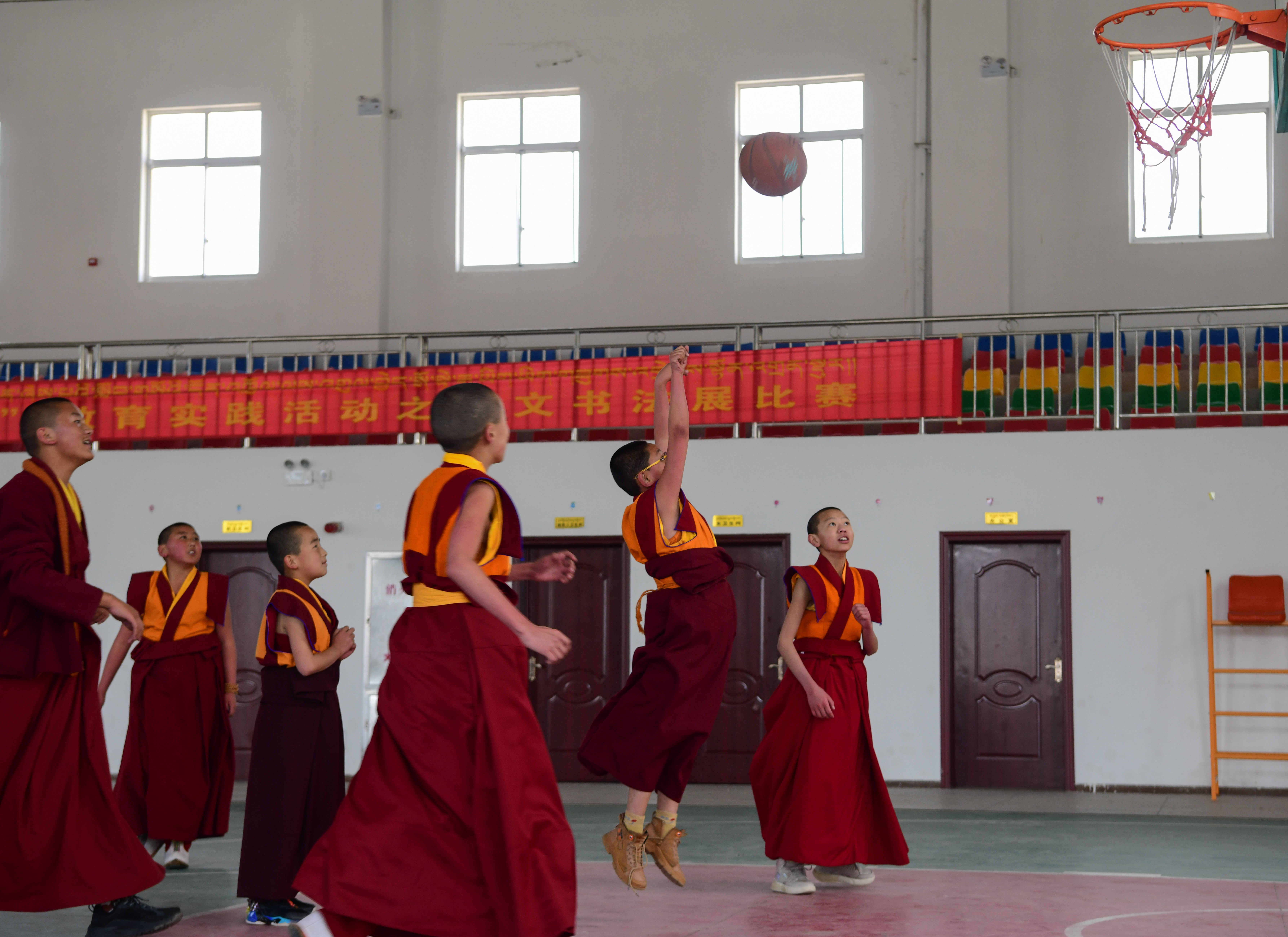 2021年3月23日,西藏佛學院開學第二日,少年活佛們上體育課打籃球。中新社記者 貢嘎來松 攝