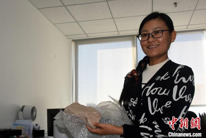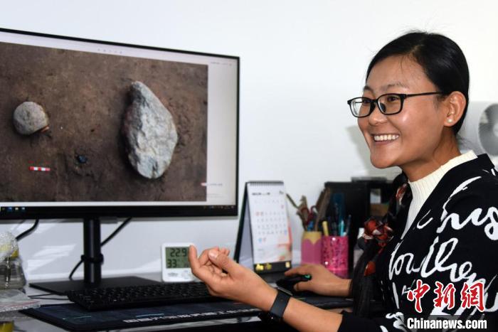 楊石霞接受采訪時(shí)展示研究的石器遺存。 中新社記者 孫自法 攝