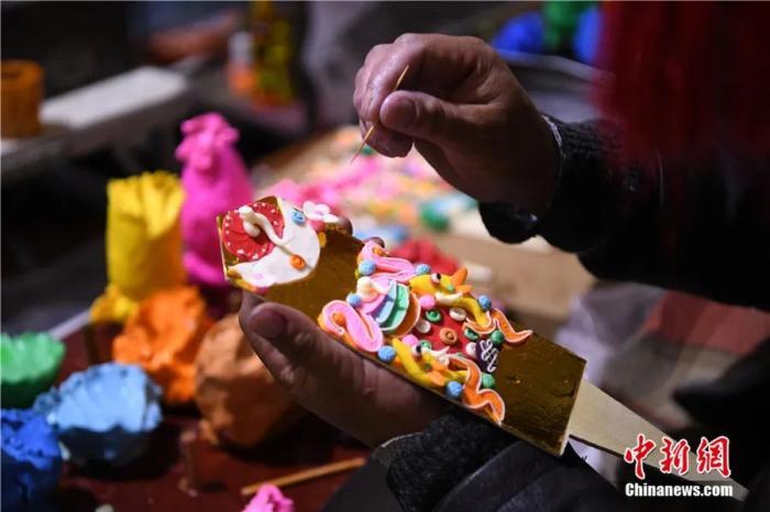2022年2月14日,酥油花手工藝人在拉薩八廓古城現場制作。藏歷新年臨近,酥油花在年貨市場熱銷。酥油花在藏語中稱為“孜扎”,是古時藏傳佛教信眾因冬季沒有鮮花供佛而發明的替代品,如今已是藏民家庭中必備的年貨之一。中新社記者 貢嘎來松 攝