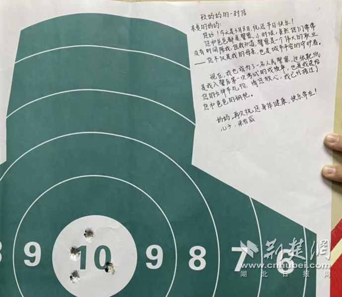 “今天收到兒子的禮物,感到很欣慰,他真的長大了。”3月8日,襄陽市公安局政治部離退休人員工作科副科長李霞收到了一份特殊的婦女節(jié)禮物——一張靶紙。靶紙的正中央十環(huán)位置有四個彈孔,右上角,有一段兒子梁哲威寫給她的話,深深觸動了她的心。