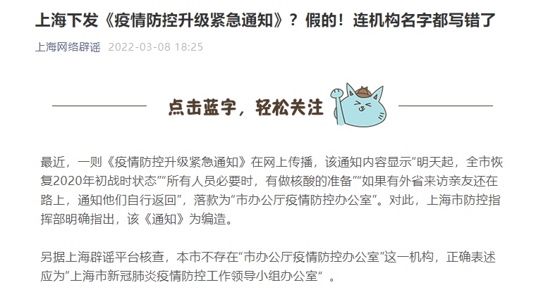 另據上海辟謠平臺核查,本市不存在“市辦公廳疫情防控辦公室”這一機構,正確表述應為“上海市新冠肺炎疫情防控工作領導小組辦公室”。