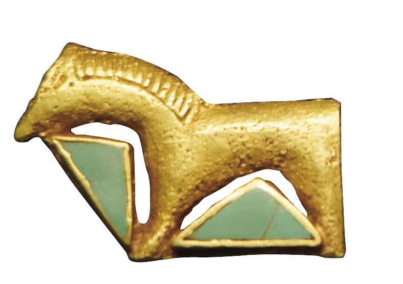 鑲嵌了綠松石的小馬造型的金飾,“臥”著一只蟾蜍的金戒指,同時(shí)刻畫(huà)了羊和熊兩種動(dòng)物形象的金飾件、眼睛由綠松石裝飾的雞骨器……這些帶有萌寵元素的綠松石文物,在展廳內(nèi)備受觀眾青睞;而巧奪天工的嵌松石立鳳金頭飾件、重達(dá)60克的嵌墨玉綠松石金耳飾等“珠光寶氣”的文物,牢牢吸引了女性參觀者的注意力。