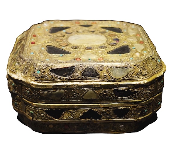 來(lái)自陜西寶雞考古研究所的金柄蟠虺紋鑲嵌綠松石鐵劍,是東周黃金鑄造工藝登峰造極之作,也被稱為“秦劍之星”;來(lái)自成都金沙遺址博物館的嵌玉片漆木器,是成都地區(qū)發(fā)現(xiàn)最早的使用鑲嵌工藝的漆器;來(lái)自內(nèi)蒙古自治區(qū)文物考古研究所的嵌寶石鎏金包銀漆盒,器物上有玉、松石、水晶、銀片,造型之精美,工藝之繁復(fù)令后人贊嘆。