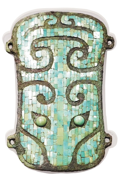 近看嵌綠松石銅牌飾,器身以青銅為主體框架,兩側(cè)各有對(duì)稱環(huán)鈕,青銅框架上以數(shù)百片綠松石拼合鑲嵌出獸面紋。綠松石嵌片加工精巧,歷經(jīng)數(shù)千年仍絲絲入扣,毫無(wú)松動(dòng),可見(jiàn)其鑲嵌技法之高超。