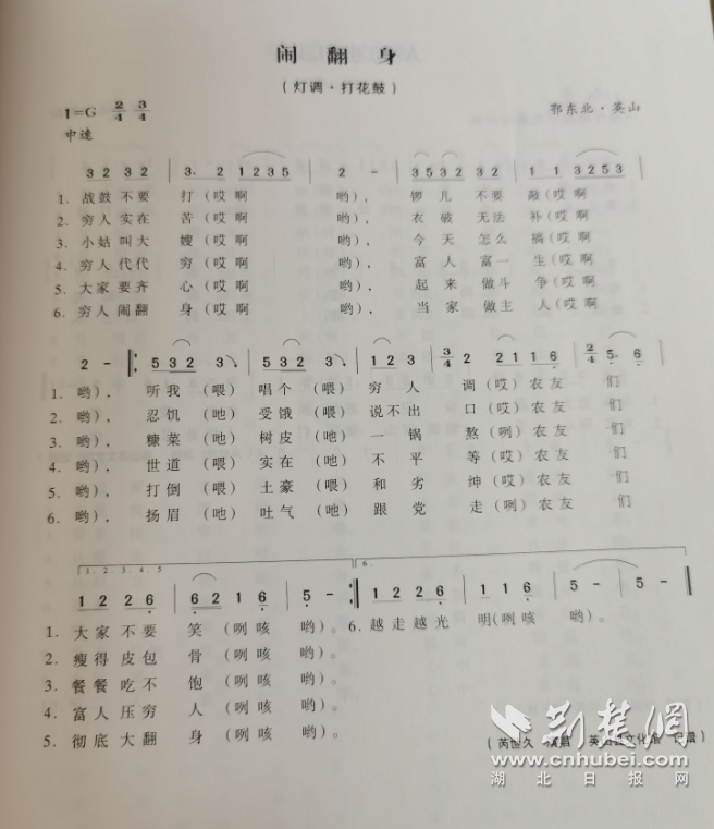 革命歷史民歌具有承載紅色革命歷程中群體性情感的特征,翻開這本厚重的書,《十勸國民黨士兵歌》《婦女求革命》《頭戴八角灰軍帽》等極富時代色彩的文字躍然紙上。由勞動人民自己創作的歌詞十分“走心”,“正月長工嘆,實在無法辦”,“打火抽袋煙,掌柜見了把眼翻”,生動反映了新民主主義革命時期的時代面貌和荊楚地方特色,以及蘇區人民的真實民間生活特色。