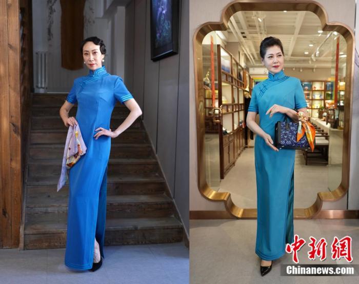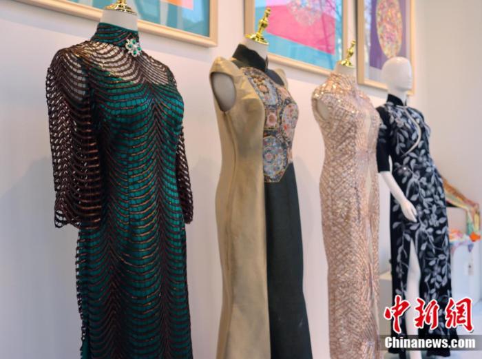 “處處皆旗袍”是該授牌儀式的一大特點。形形色色的旗袍陳列于櫥窗中,或簇花藍底,韻味幽深;或鏤空設計,風格復古;或多色拼接,明艷俏皮,讓人眼花繚亂。