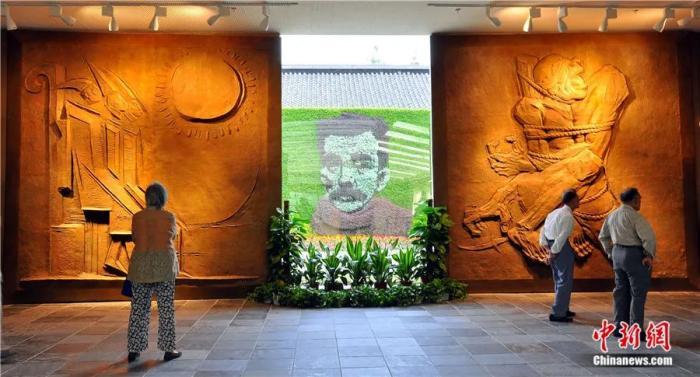 2011年,在上海魯迅紀念館,觀眾觀看巨幅浮雕《吶喊》《彷徨》。中新社發 周東潮 攝