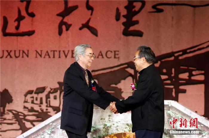 2007年,第四屆魯迅文學獎在浙江紹興魯迅故里舉行頒獎典禮。魯迅筆下閏土的原型章運水的孫子章貴在頒獎典禮現場與與魯迅之子周海嬰見面。中新社記者 袁云 攝