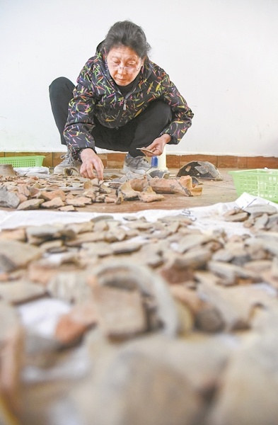 今年65歲的張從翠已退休十多年,她和團隊已在走馬嶺遺址連續工作近2個月,任務是在1000多片陶器碎片中,不斷找出相鄰兩塊,拼接、粘合,最后形成一件完整的器物。