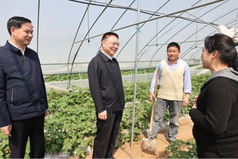 城關鎮小豐山村近年來因地制宜發展蔬菜產業,穩定帶動農戶增收。大棚內,土豆、萵苣長勢喜人。王蒙徽走進大棚,向正在勞作的農戶了解種植、銷售、收入等情況,鼓勵脫貧戶依托基地,團結協作,增收致富。王蒙徽對鎮村干部說,要立足本地特色資源,把農民組織起來,大力培育帶動能力強的富民產業,發展壯大村級集體經濟,有力助推鄉村振興。