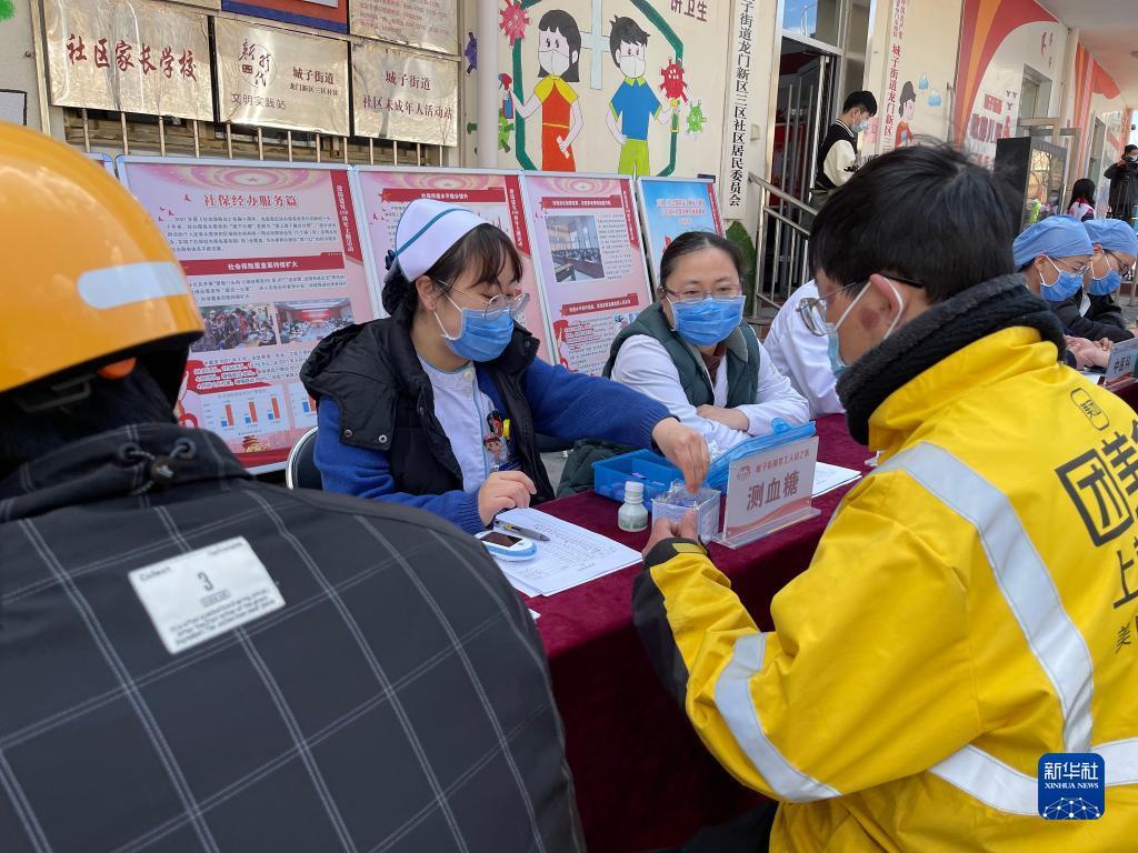 3月31日,在北京市門頭溝區(qū)“務(wù)工人員之家”城子分站,一位快遞小哥正在體驗(yàn)義診服務(wù)。(新華社記者陳旭攝)