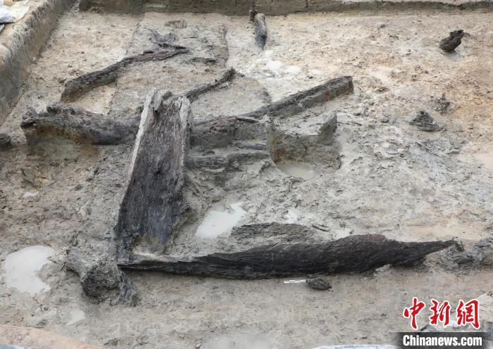 良渚文化時(shí)期河道(G9)中的木構(gòu)排水設(shè)施。 王永磊提供