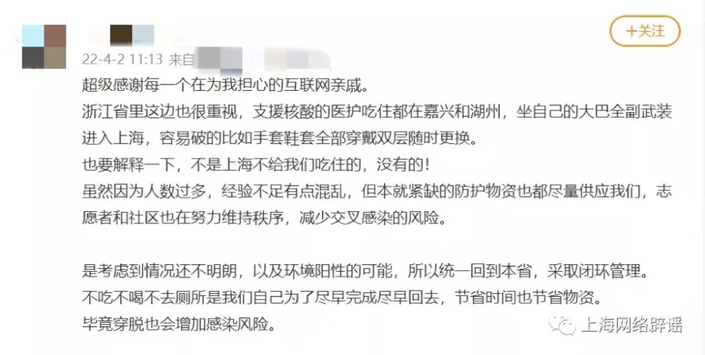 也有參與支援上海的浙江醫護人員主動通過社交平臺發聲,澄清網傳“浙江醫護不住上海”“沒吃沒喝”的謠言。