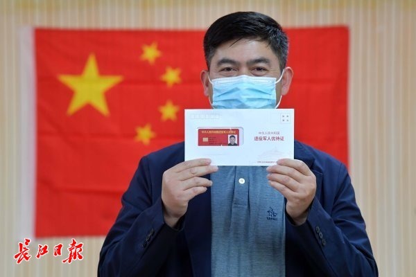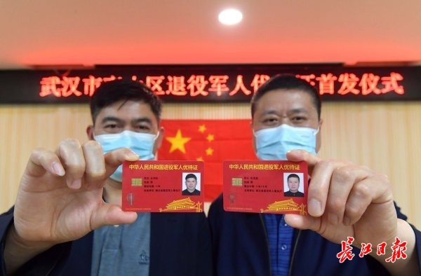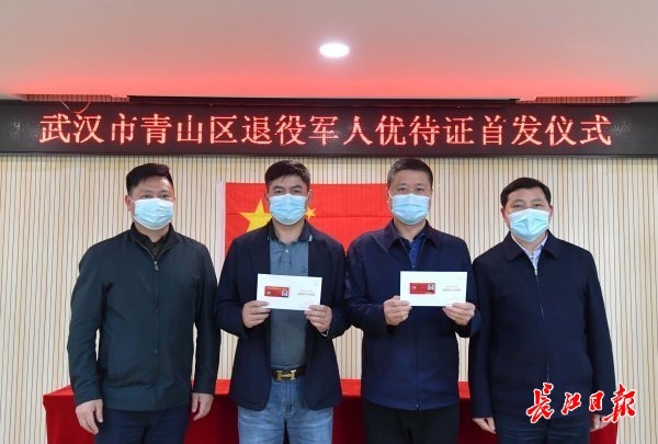 4月6日,武漢市青山區(qū)發(fā)放全市首批優(yōu)待證。退役軍人張茂益、佘鴻欽獲得首批優(yōu)待證。 長江日報(bào)記者劉斌 攝