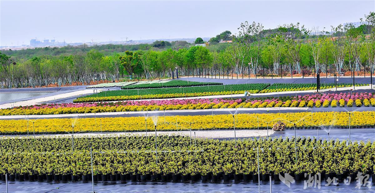 4月6日,位于武漢東西湖區柏泉古鎮的柏泉生態營地內,整齊劃一地擺放著數萬盆景,其間的數十臺自動灌溉機不停地噴水,給盆景澆水,引來游客看稀奇。