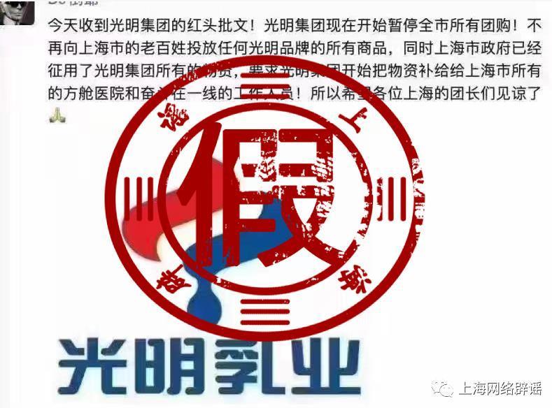 中新財經4月12日電 據“上海網絡辟謠”微信公眾號消息,近日,一張截屏令很多上海“團長”“團友”擔心:“今天收到光明集團的紅頭批文!光明集團現在開始暫停全市所有團購!不再向上海市的老百姓投放任何光明品牌的所有商品……希望各位上海的團長們見諒了”。