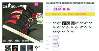 記者隨后搜索得知,這種爪子刀其實(shí)是模仿了一款槍?xiě)?zhàn)游戲中的道具。因?yàn)樵撚螒蛑械牡毒呔陀卸喾N顏色,商家才仿制出了多種款式。記者還發(fā)現(xiàn),網(wǎng)上竟然能找到這些刀具的“使用視頻”,但并非是用來(lái)防身,而是“旋轉(zhuǎn)把玩”。