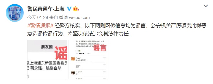 上海市公安局官方微博發布警情通報:經警方核實,以下兩則網傳信息均為謠言,公安機關嚴厲譴責此類惡意造謠傳謠行為,將堅決依法追究其法律責任。