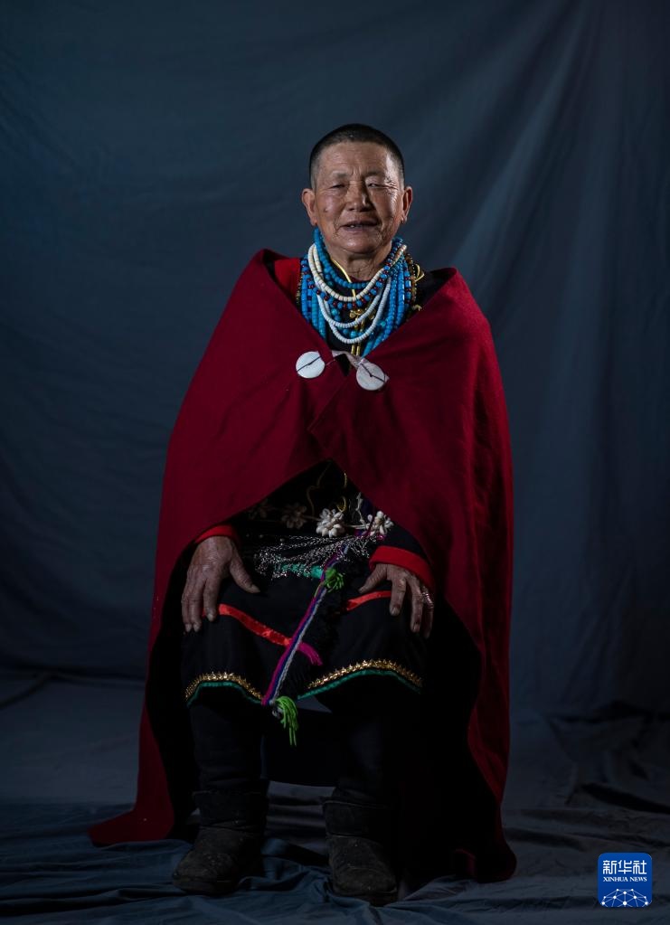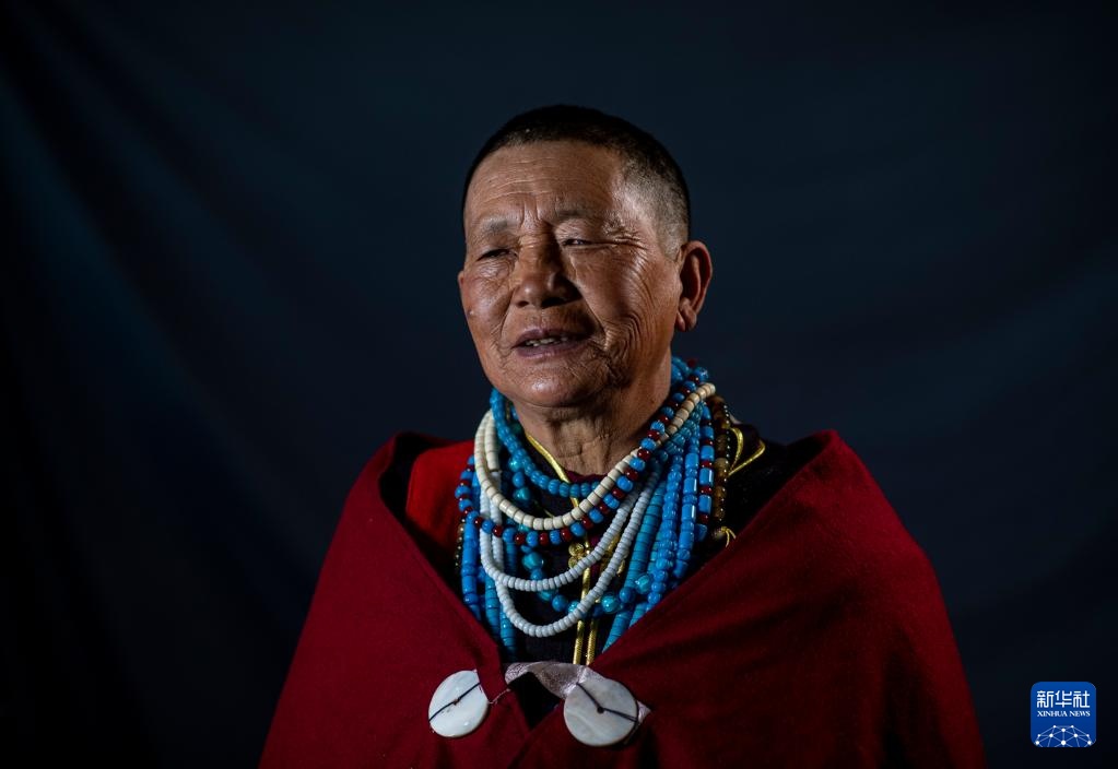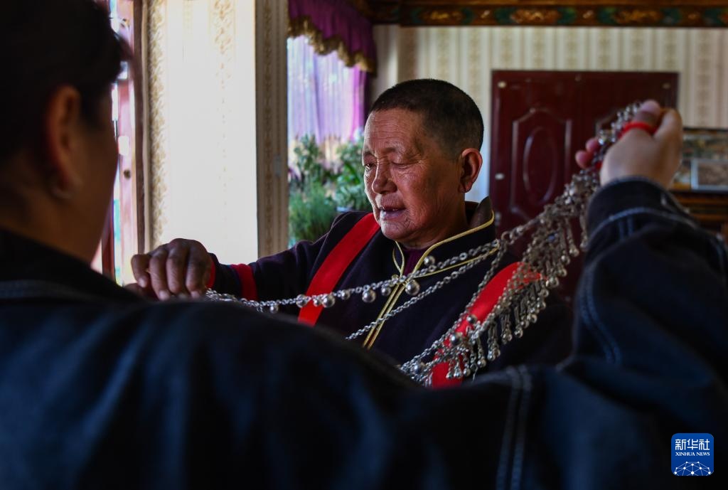 亞保老人在穿戴傳統珞巴族服飾(4月12日攝)。