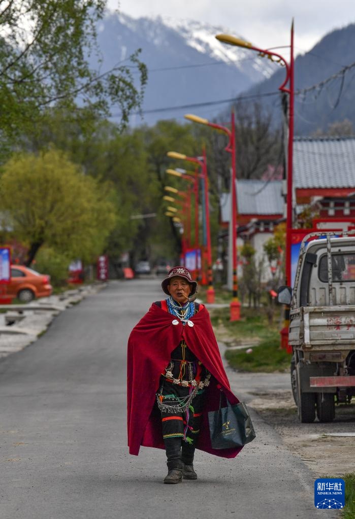亞保老人行走在才召村街頭(4月12日攝)。