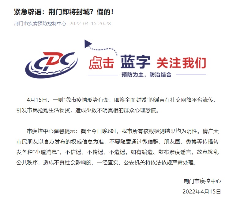 荊門市疾控中心溫馨提示:截至今日(15日)晚6時(shí),我市所有核酸檢測(cè)結(jié)果均為陰性。請(qǐng)廣大市民朋友以官方發(fā)布的權(quán)威信息為準(zhǔn),不要隨意通過微信群、朋友圈、微博等傳播轉(zhuǎn)發(fā)各種“小道消息”,不信謠、不傳謠、不造謠。如有編造、散布涉疫謠言,故意擾亂公共秩序,造成不良社會(huì)影響的,一經(jīng)查實(shí),公安機(jī)關(guān)將依法依規(guī)嚴(yán)肅處理。