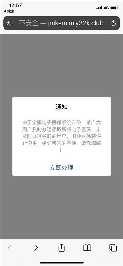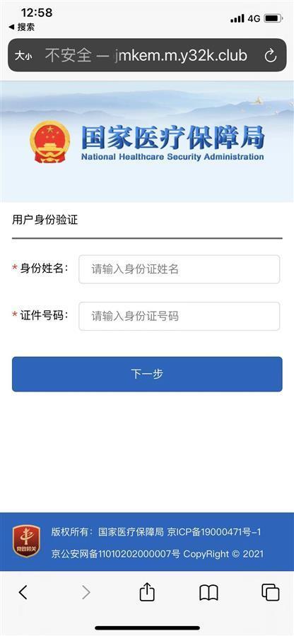 “【12333】您的醫用卡已禁用,請于04月14日前至j.y32K.club補錄信息后啟用!”4月13日12點04分,武漢市民鄭先生收到了一條這樣的短信。隨后,他按照提示,點擊短信里的鏈接,立即彈出一條通知。通知內容為“由于全國電子醫保系統升級,請廣大用戶及時辦理領取新版電子醫保,未及時辦理領取的用戶,舊版醫保將停止使用,給你帶來的不便,請你諒解!立即辦理”。點擊“立即辦理”后,即跳轉至一個有“國家醫療保障局”字樣的網站,要求用戶進行身份驗證,需要輸入身份姓名、證件號碼等信息。