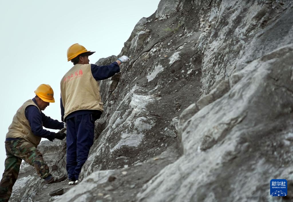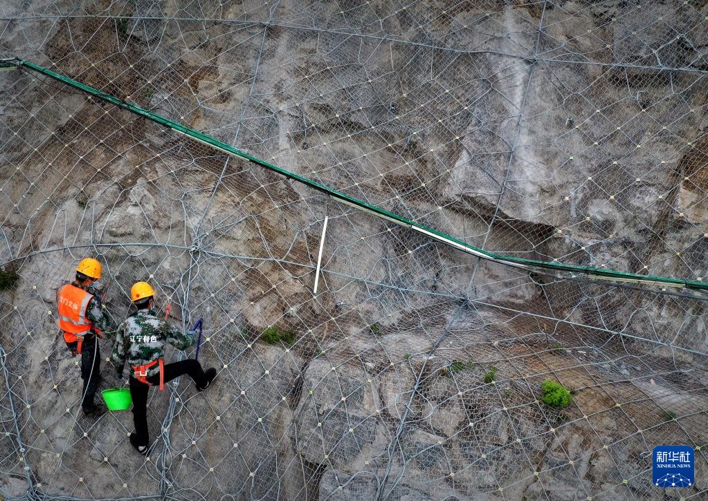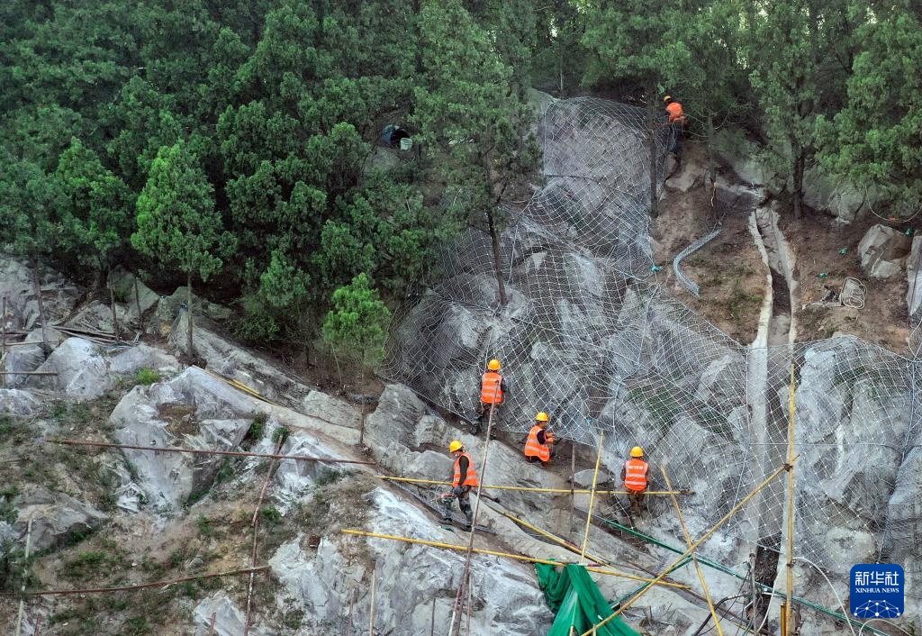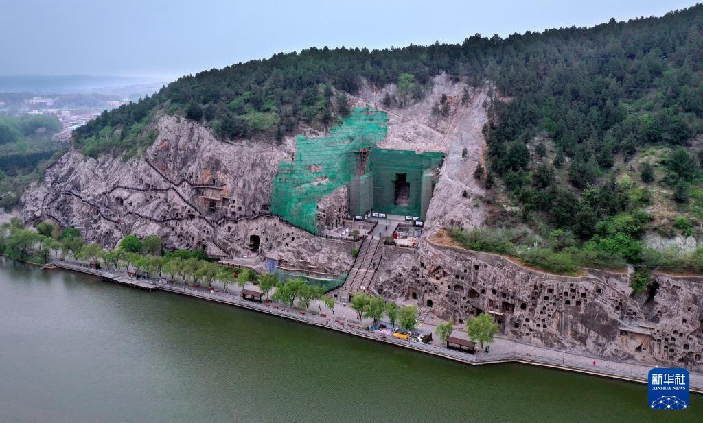 工作人員在洛陽龍門石窟奉先寺安裝防護網(4月13日攝,無人機照片)。