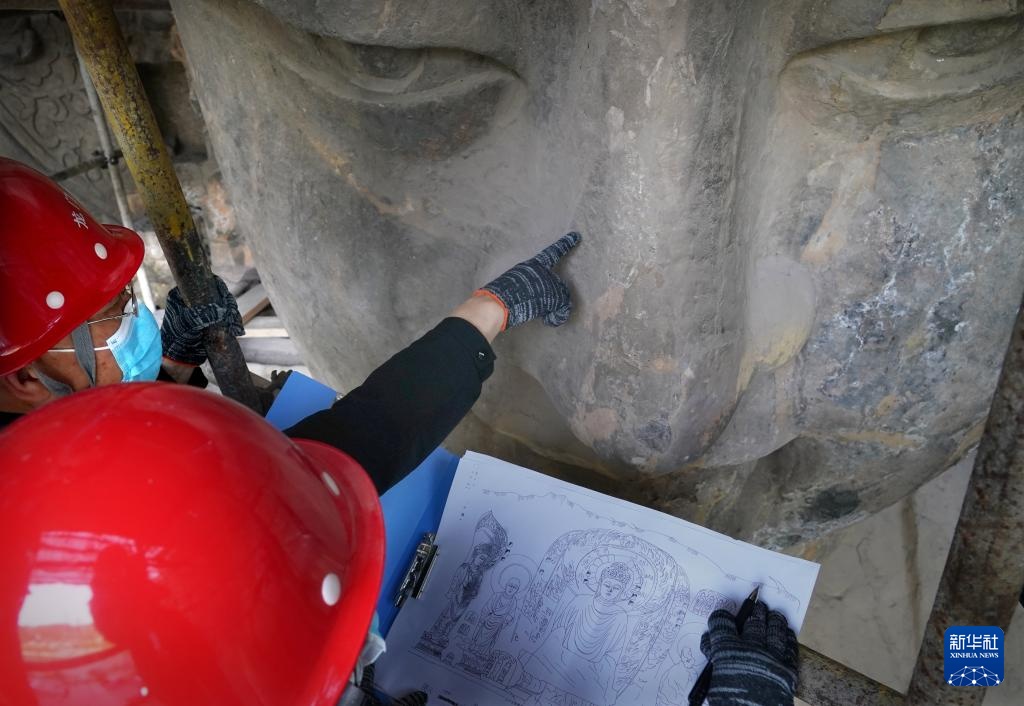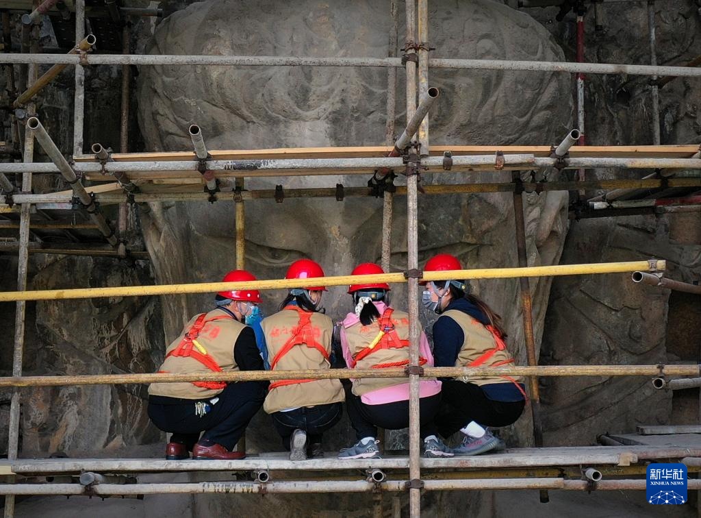 工作人員在洛陽龍門石窟奉先寺進行保養維護(4月13日攝)。