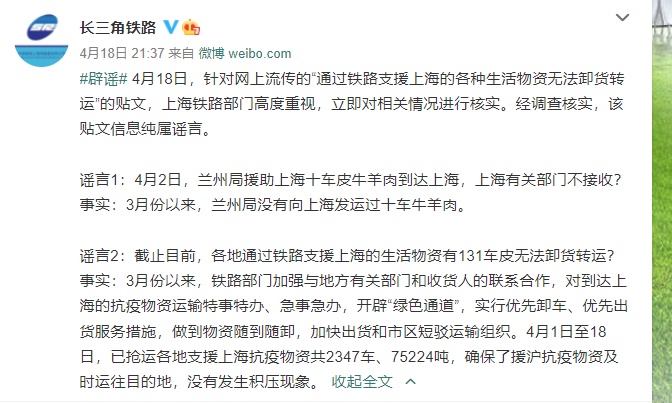 4月19日,中國鐵路上海局集團有限公司通過官方微博辟謠,表示以上信息均為謠言。