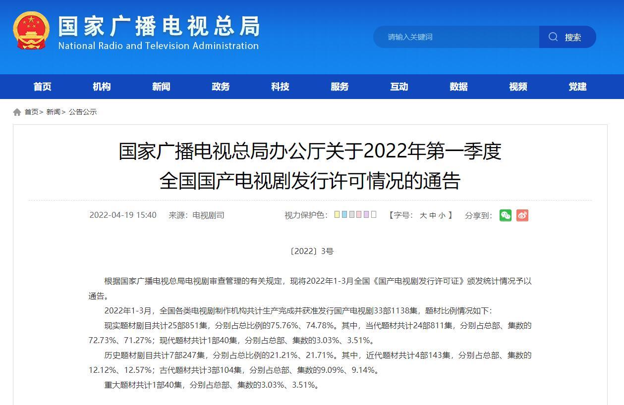 中新文娛4月19日電 據國家廣播電視總局網站消息,國家廣播電視總局辦公廳近日發布《關于2022年第一季度全國國產電視劇發行許可情況的通告》稱,2022年1-3月,全國各類電視劇制作機構共計生產完成并獲準發行國產電視劇33部1138集。