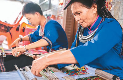 在貴州黔東南苗族侗族自治州,各族非遺傳承人群大大受益于非遺研培計劃、傳統(tǒng)工藝工作站和非遺扶貧工坊。如苗族蠟染傳承人楊秀芳2016年到清華大學非遺研修班學習。學成歸來后,她開拓了眼界,提升了文化自信,在大山深處組織苗寨婦女從事手工藝生產(chǎn),她的女兒還將銷售門店開到了丹寨縣。