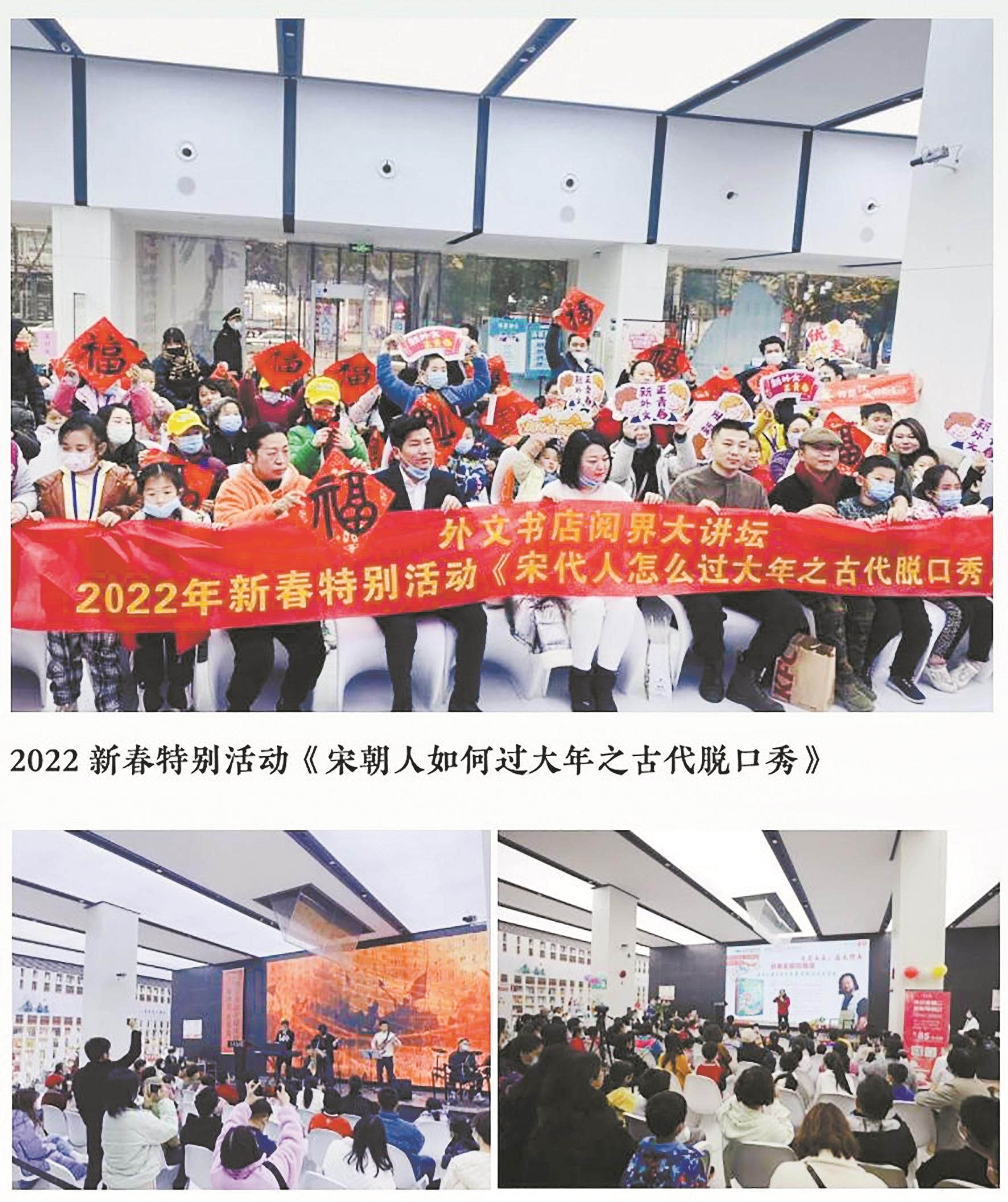 2019年以來,外文書店累計舉辦線上線下品牌文化活動近1500余場,其中線上活動近500期,觀看數(shù)達(dá)53萬人。《宋朝人如何過大年之古代脫口秀》《外文書店·悅音山海 新年音樂會》《兒童文學(xué)作家董宏猷新書分享會〈故宮一千零一夜2〉》……店內(nèi)開展閱界大講壇、曉得、拾藝生活、小V樂園、外語角五大品牌活動1000場、店外開展“十進(jìn)一創(chuàng)”活動百余場,參與人員達(dá)20萬余人次。