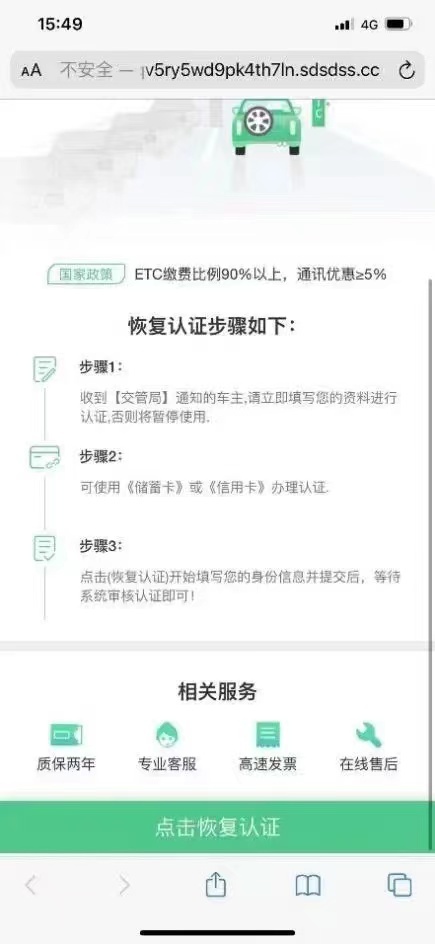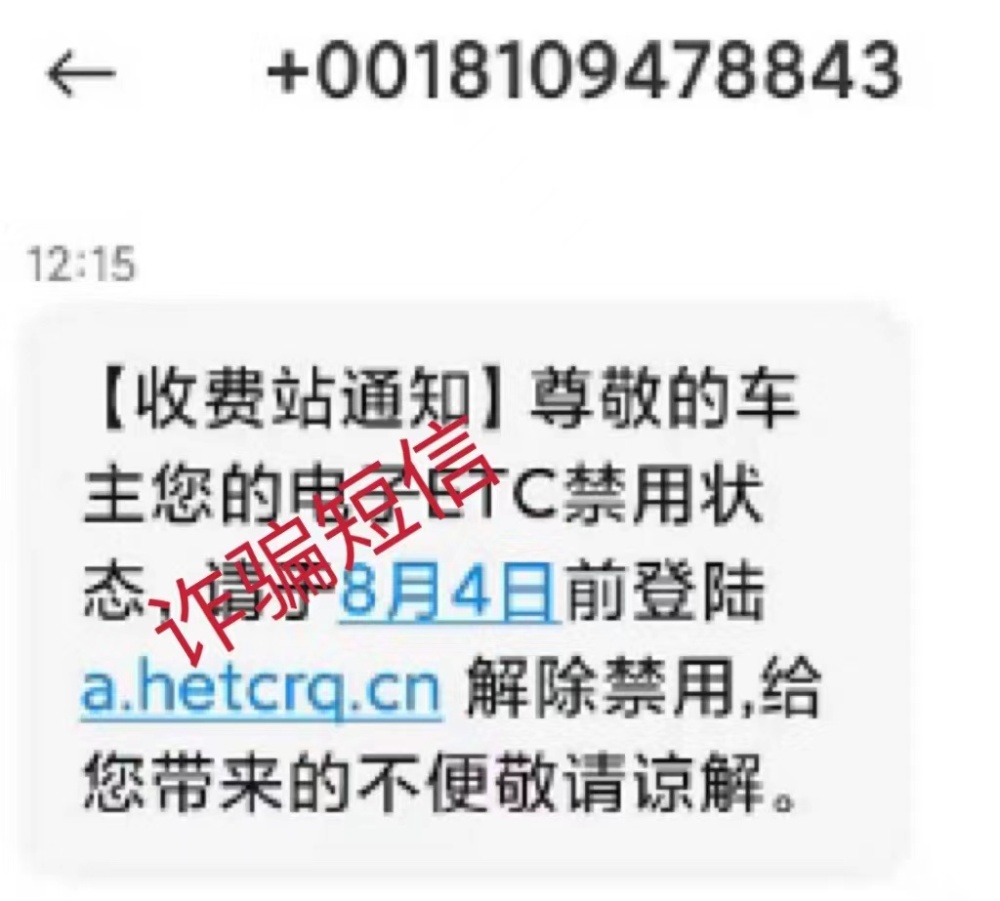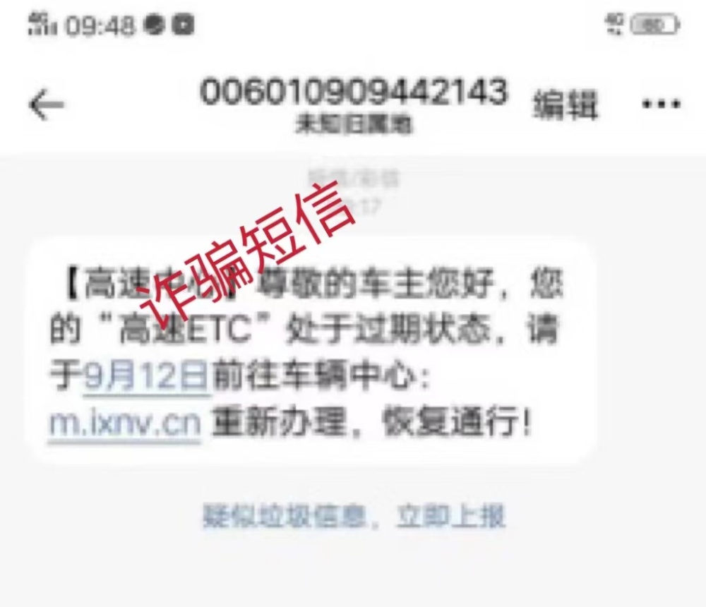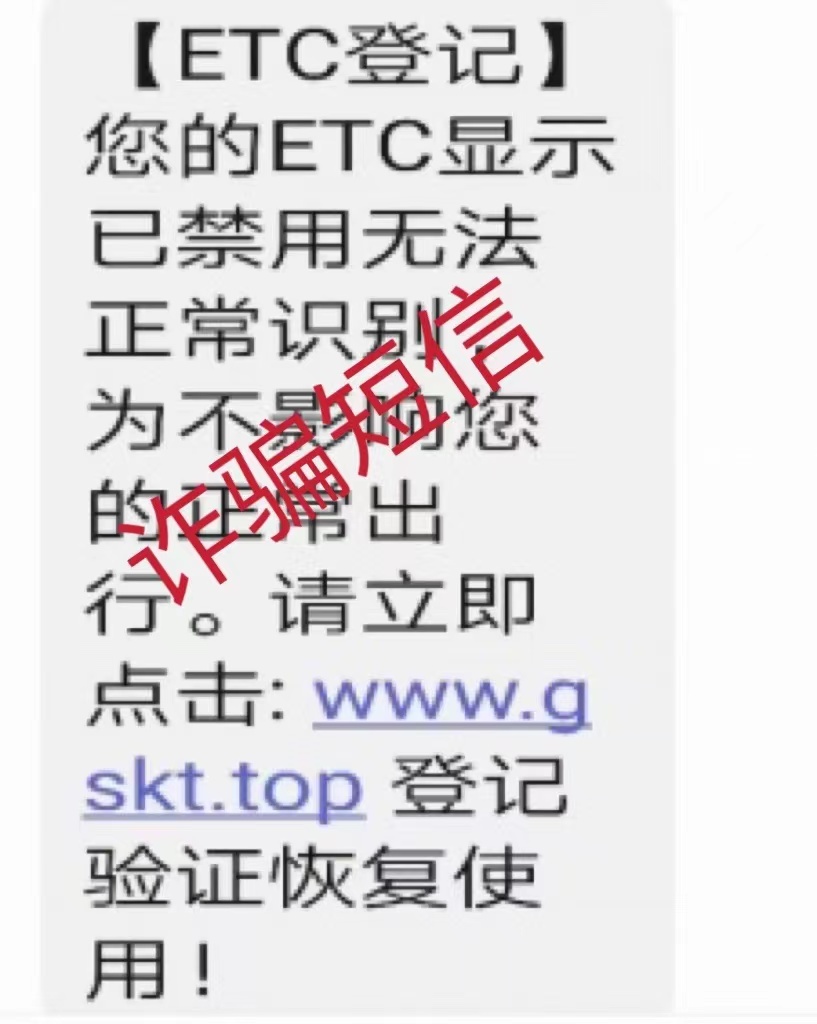 自ETC普及以來,各式各樣的詐騙短信層出不窮,不法分子冒充“ETC中心”“高速管理中心”“交管局”等機構,通過發送短信“ETC過期認證、系統升級、失效激活”等內容,并附帶業務辦理的網頁鏈接,誘騙用戶點擊鏈接。