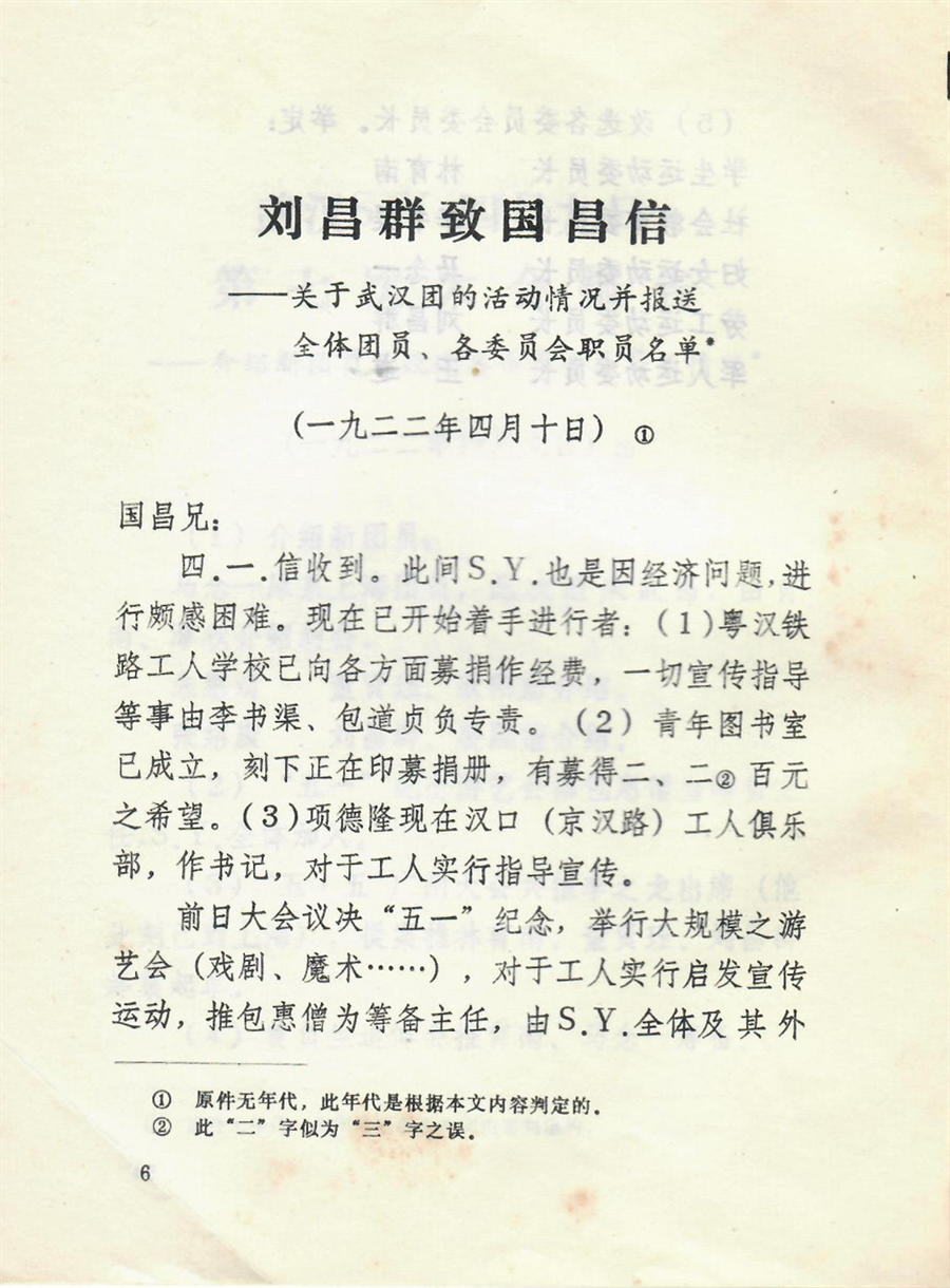 信中介紹:“現(xiàn)已開始著手進(jìn)行者:(1)粵漢鐵路工人學(xué)校已向各方面募捐作經(jīng)費(fèi),一切宣傳指導(dǎo)等事由李書渠、包道貞負(fù)專責(zé)。(2)青年圖書室已成立,刻下正在印募捐冊,有募得二、三百元之希望。(3)項德隆現(xiàn)在漢口(京漢路)工人俱樂部,作書記,對工人實(shí)行指導(dǎo)宣傳。