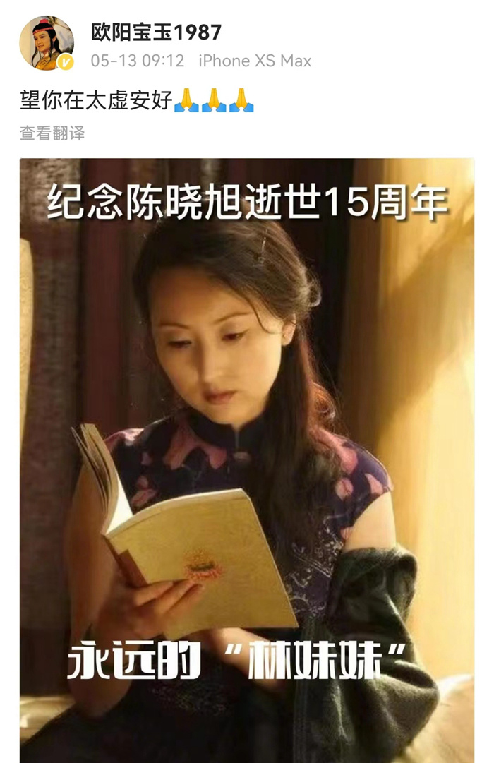 在陳曉旭逝世15周年后,賈寶玉扮演者歐陽奮強發微博紀念:“望你在太虛安好圖片圖片圖片”。